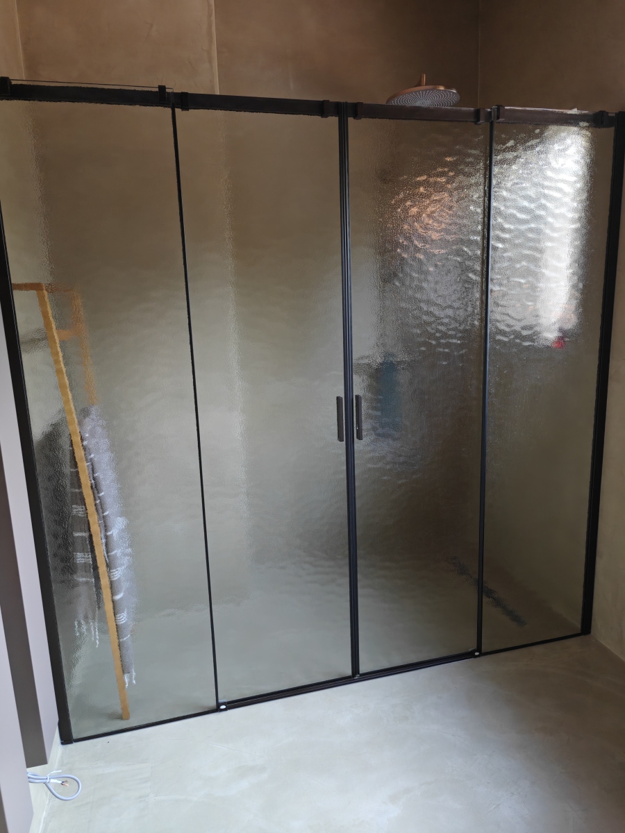 - De schuifdeur met kathedraalglas en mokka profielen is van het Merk Vismara Vetro.