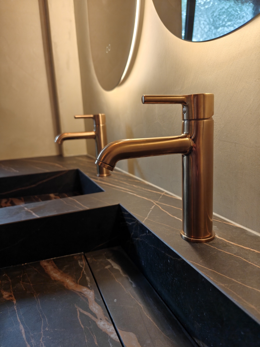 - Het kraanwerk in geborsteld brons is van Hansa.